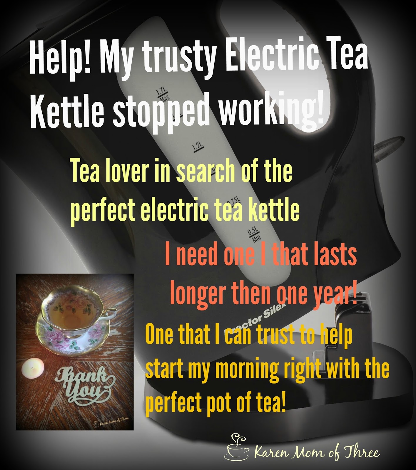 My trusty $19 special from Walmart a plastic kettle that heated up my tea water on demand died. I am now using my tiny travel $9 special and it's not really getting the job done. So I have been looking at investing in a better kettle one I hope will last longer then one year.